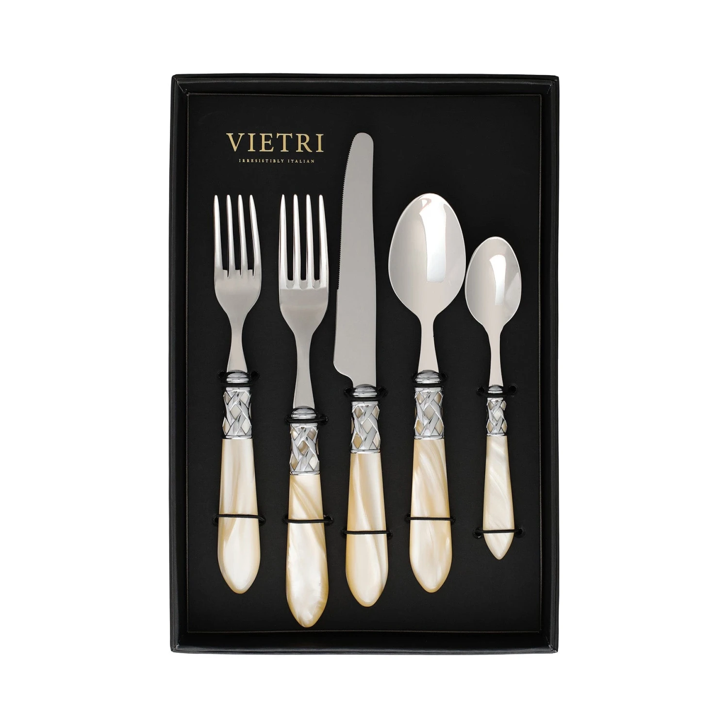 The Aladdin Brilliant Five-Piece Place Setting (Set of 4) features elegant pearlized handles with the strength of high-grade acrylic and 18/10 stainless steel. The brilliant finish on the handle has a sophisticated, updated look.