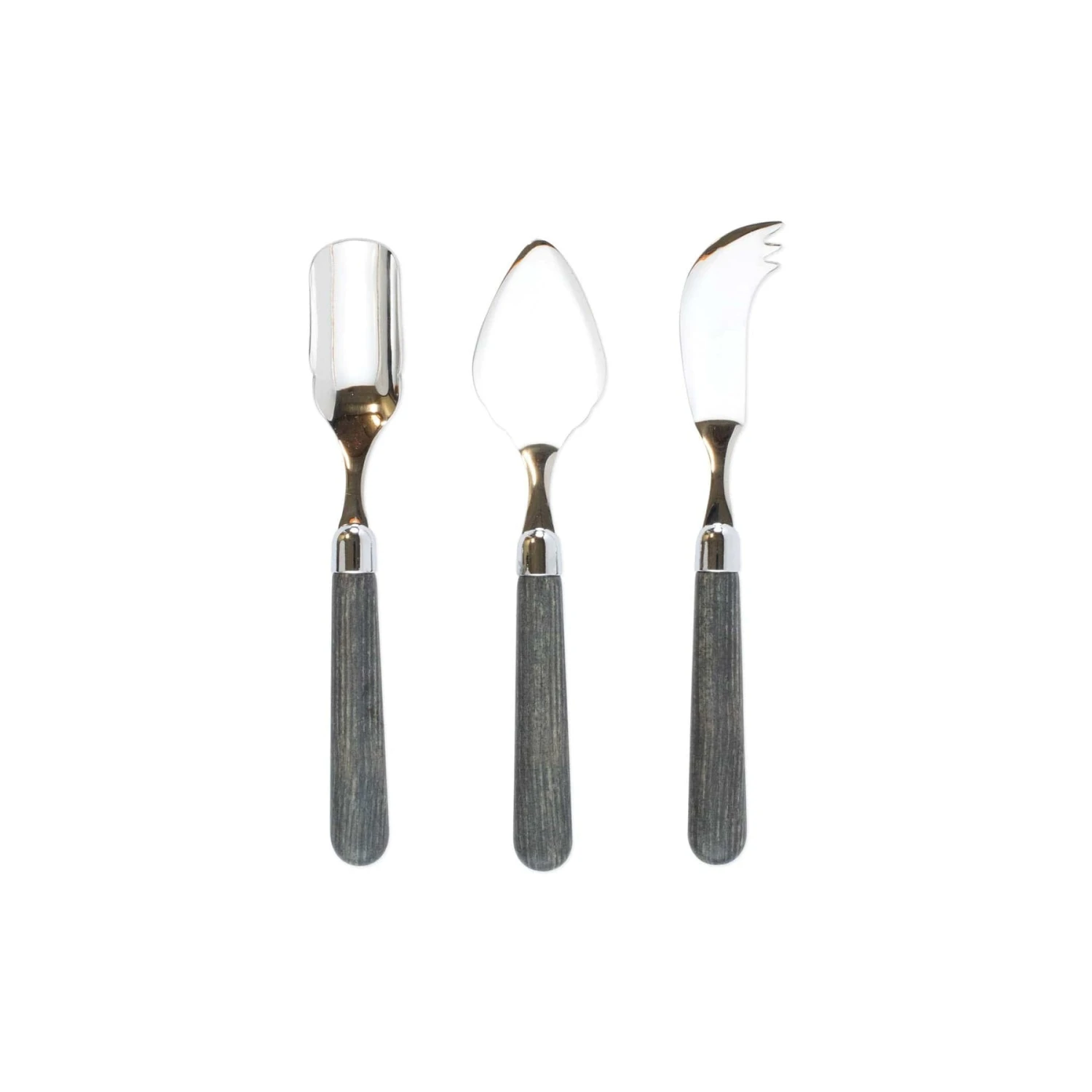 The Albero Cheese Knife Set in muted black features warm wood handles, with the strength of high-grade polyester and 18/10 stainless steel.