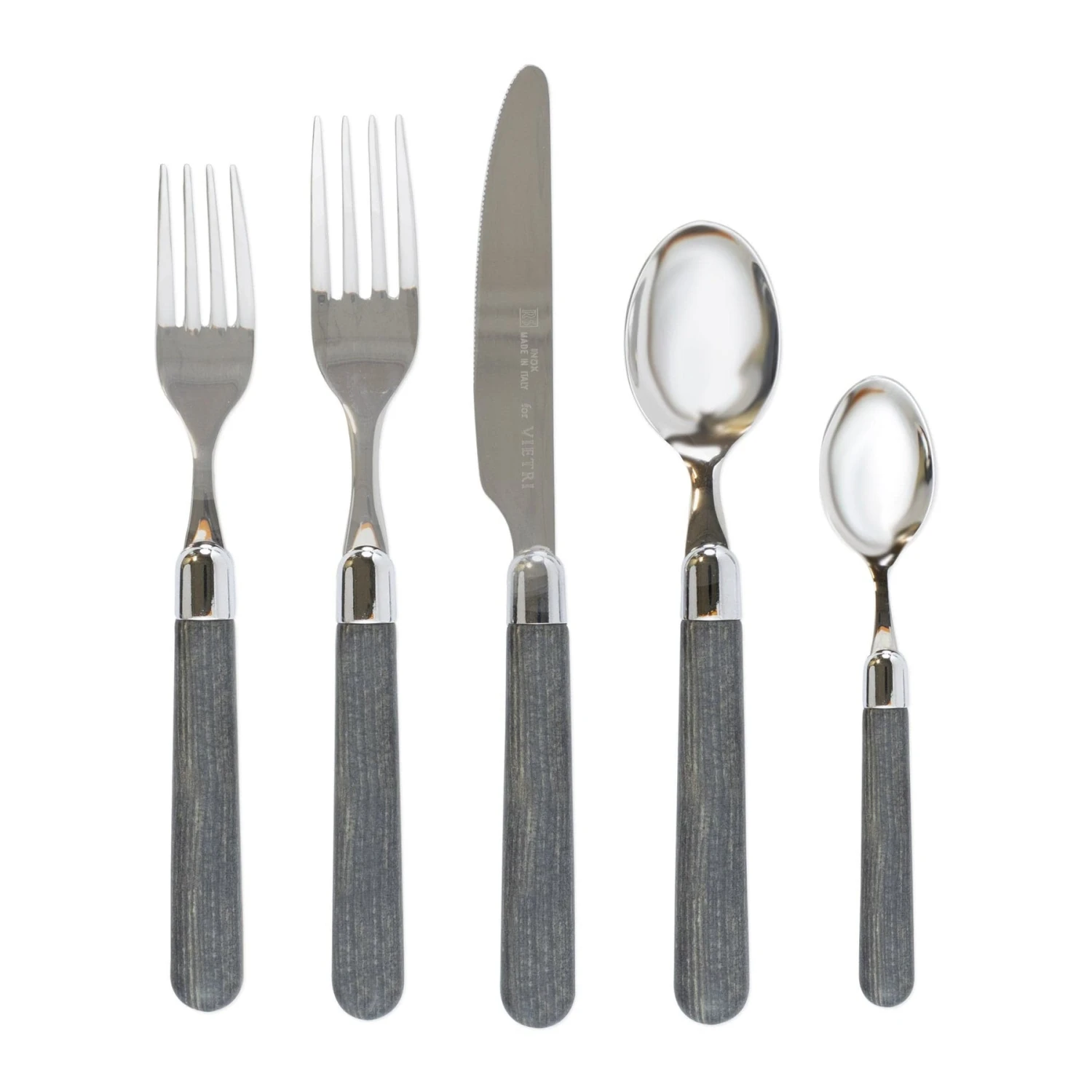 The Albero Five-Piece Place Setting in muted black features warm wood handles, with the strength of high-grade polyester and 18/10 stainless steel.