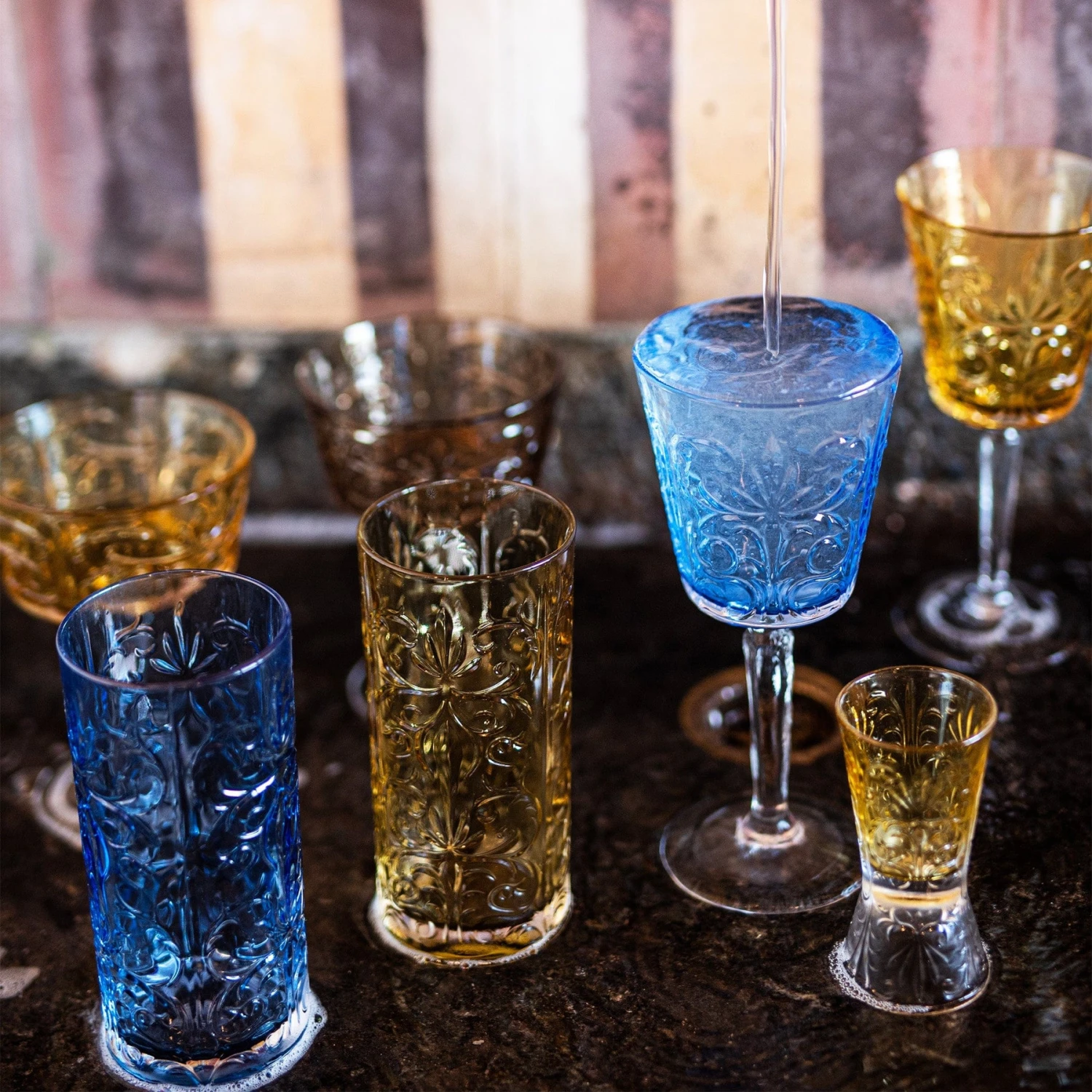 The artful etchings, stately shapes, and rich color of Barocco Cobalt High Ball honor Italy’s 17th century Baroque period and bring a gracious grandeur to your gatherings.