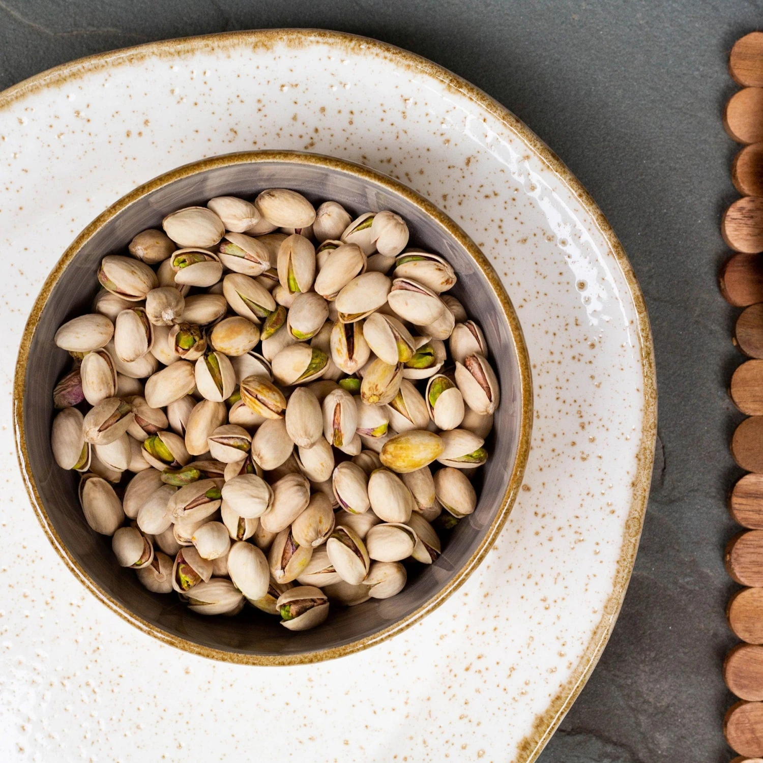 The Earth Eggshell Oval Platter combines mid-century neutral tones with an angled silhouette in a playful handpainted pattern.