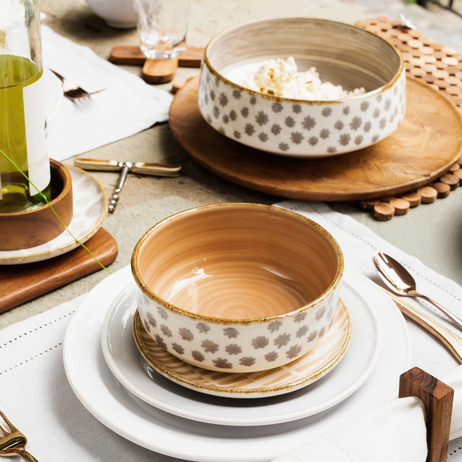 The Earth Flower Small Bowl combines mid-century neutral tones with an angled silhouette in a playful handpainted pattern.