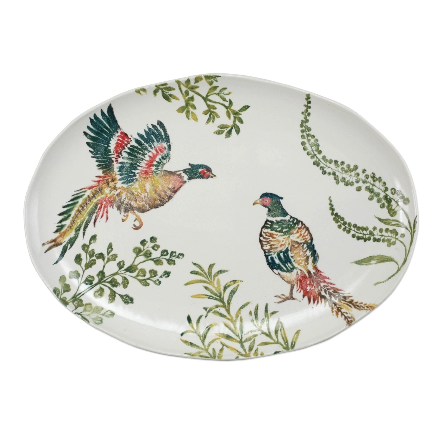 The Fauna Pheasants Large Oval Platter combines the outline of the classic hunting bird paired with nature’s greenery to depict what is commonly found during the hunt (la caccia) in Umbria, the Italian land known for capturing wild pheasants.
