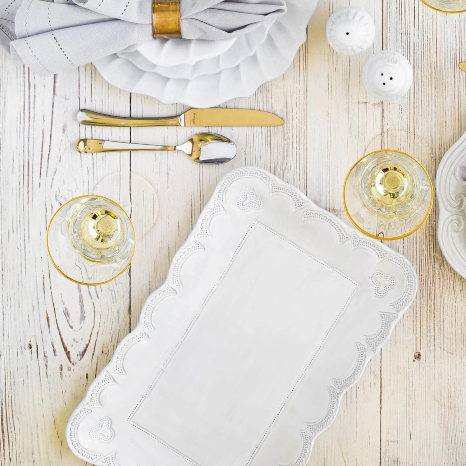Italian for enchantment, Incanto is inspired by Italian art, the landscape, and Venetian history. The intricate designs on the Incanto Lace Small Rectangular Platter pay homage to the famed lace of Venice’s Burano island, bringing beauty, elegance, and irresistible Italian style to your home.
