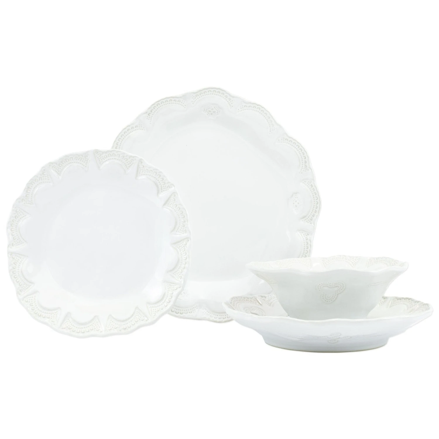 Italian for enchantment, Incanto is inspired by Italy’s art, landscape, and Venetian history. The designs on the Incanto Stone Four-Piece Place Setting pay homage to the famed lace of Venice’s Burano Island. The Place Setting includes a dinner plate, salad plate, pasta bowl, and cereal bowl. Set a table full of Incanto Lace settings or mix and match them with other designs from the collection.