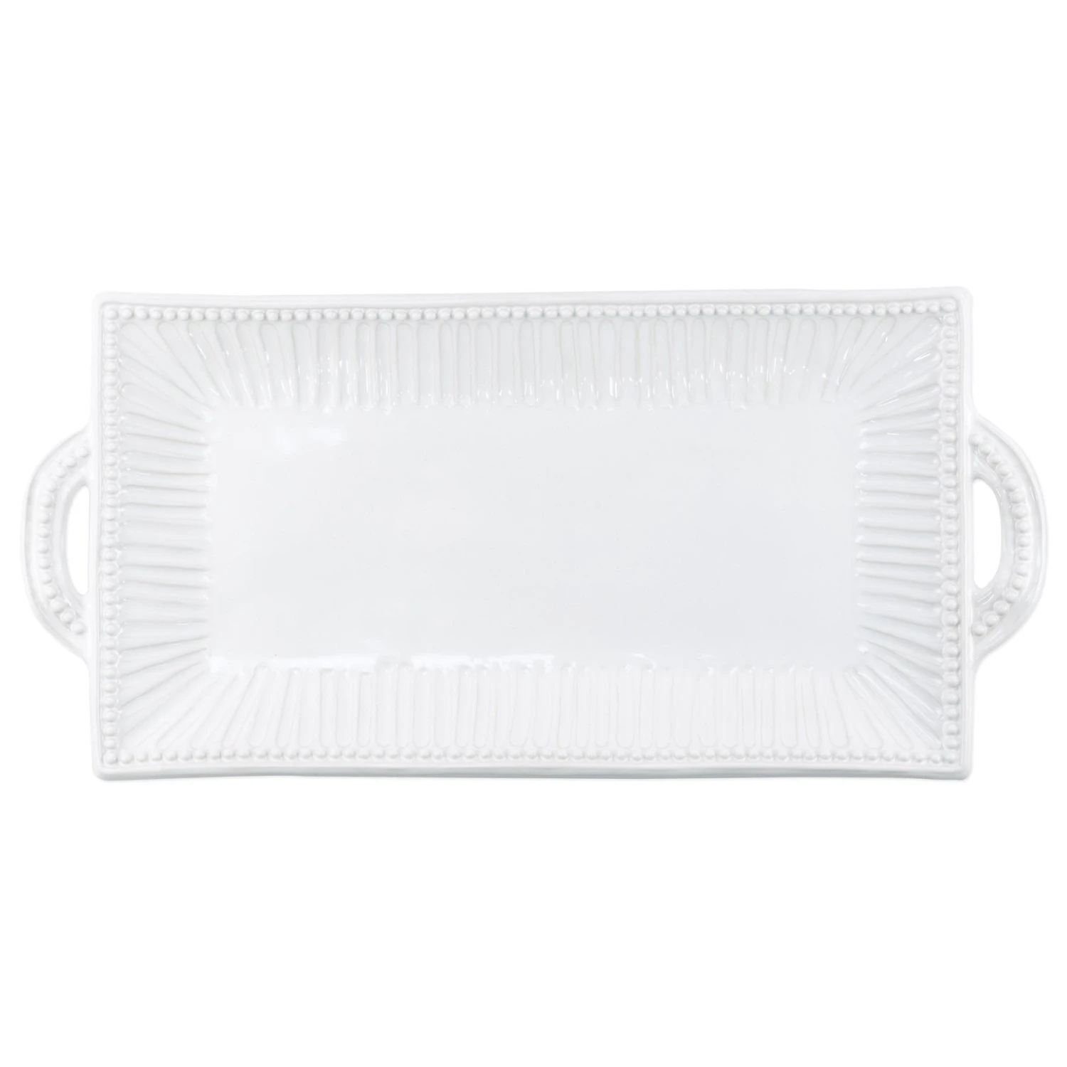 Italian for enchantment, Incanto is inspired by Italian art, the landscape, and Venetian history. The handcarved stripes on the Incanto Stone White Stripe Handled Rectangular Platter honor the columns of the Palladian villas along the Brenta River. This serving piece is a crowd-favorite, and it brings irresistible Italian style to everything you serve.