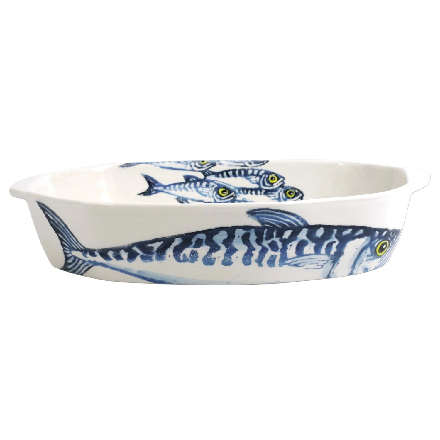 The Maccarello Baker illustrates a school of blue mackerel, commonly found along the Mediterranean and Adriatic Sea, handpainted by maestro artisan, Gianluca Fabbro, using his unique sponging technique.