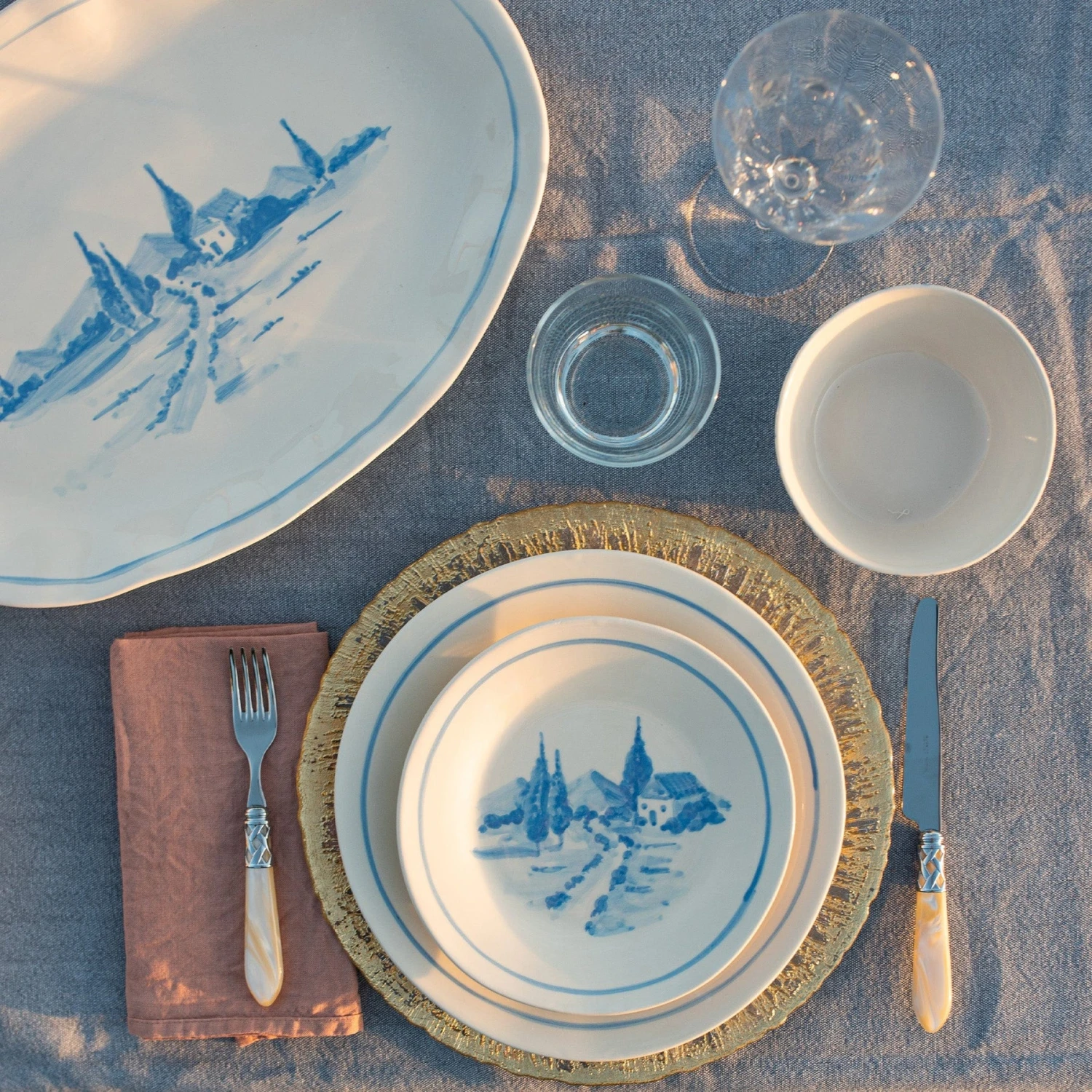 A handpainted Tuscan scene in a perennial favorite shade of light blue adorns the Modello Tuscan Dinner Plate.