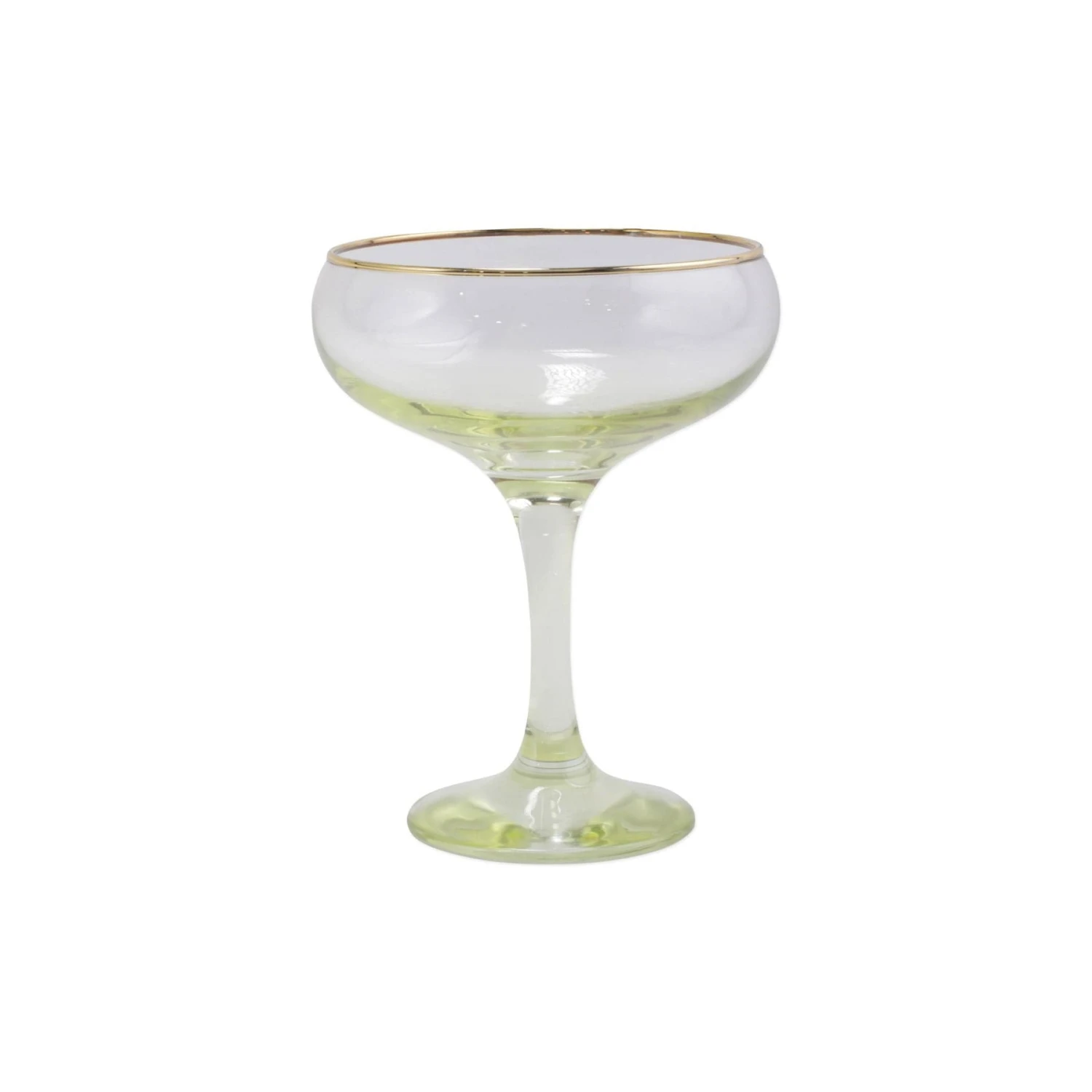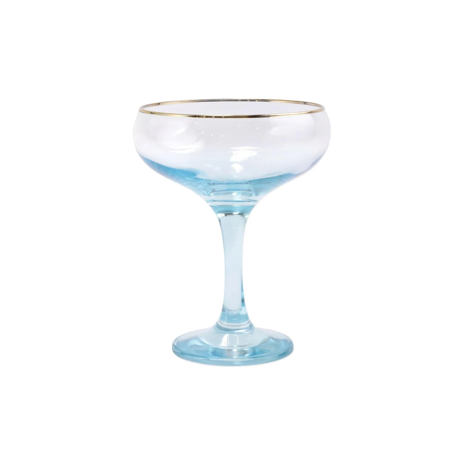 Add sparkle to any setting with a gilded gold rim and varied colored glass that refracts light on the Rainbow Assorted Coupe Champagne Glasses – Set of 4.