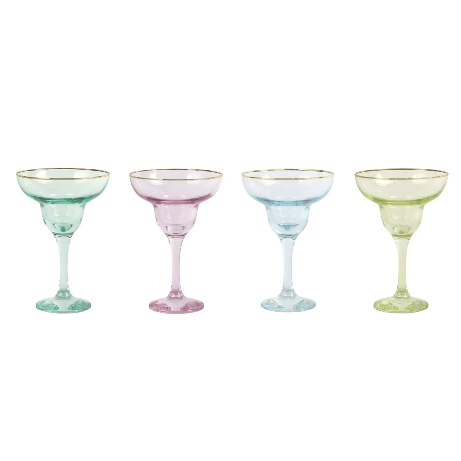 Add sparkle to any setting with a gilded gold rim and varied colored glass that refracts light on the Rainbow Assorted Margarita Glasses – Set of 4.