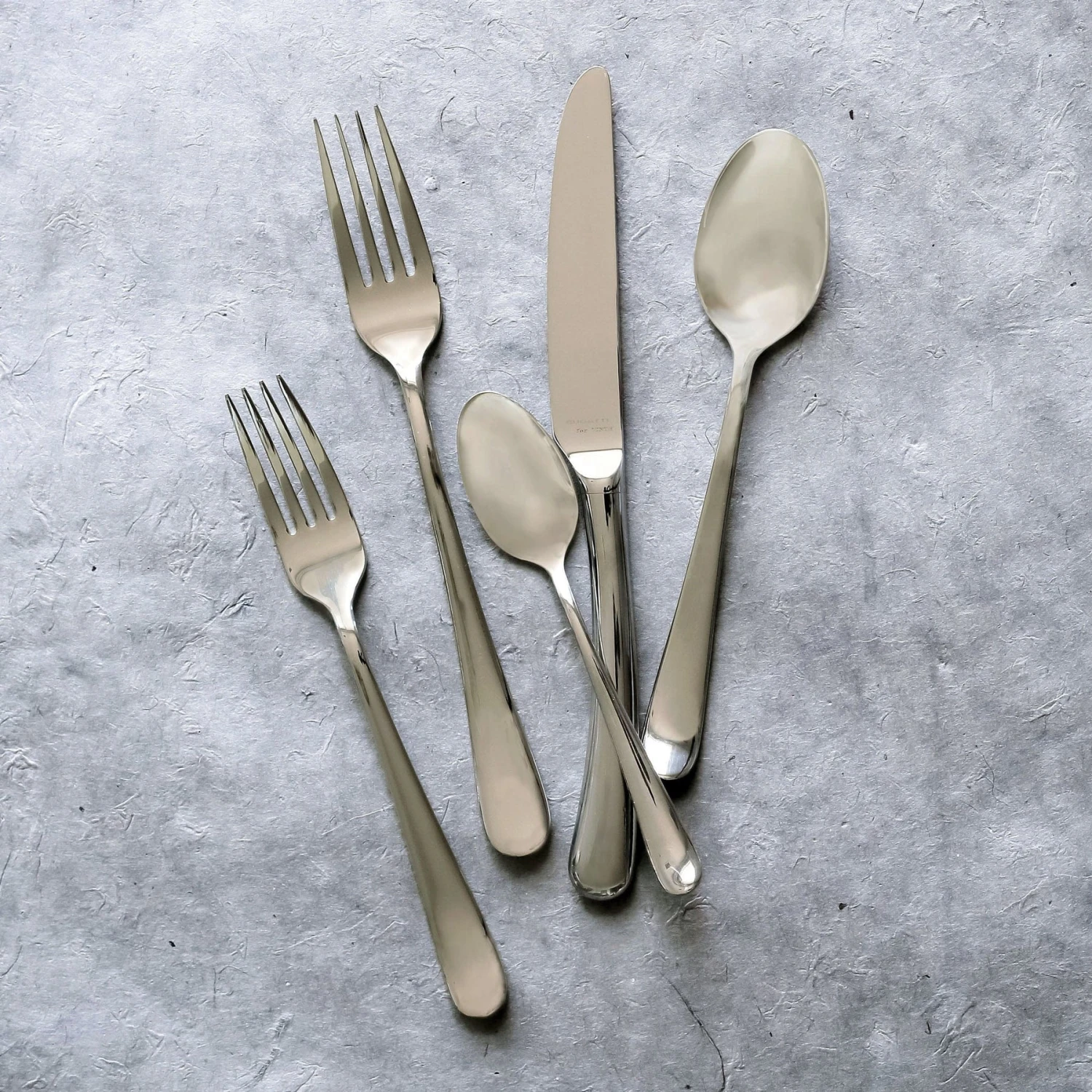 Soft, elegant lines grace each piece of the Settimocielo Five-Piece Plate Setting. Translated “seventh heaven,” an emphasis on balance and comfort is prevalent with this design. The knife is hollow-handled with a forged blade for cutting precision.