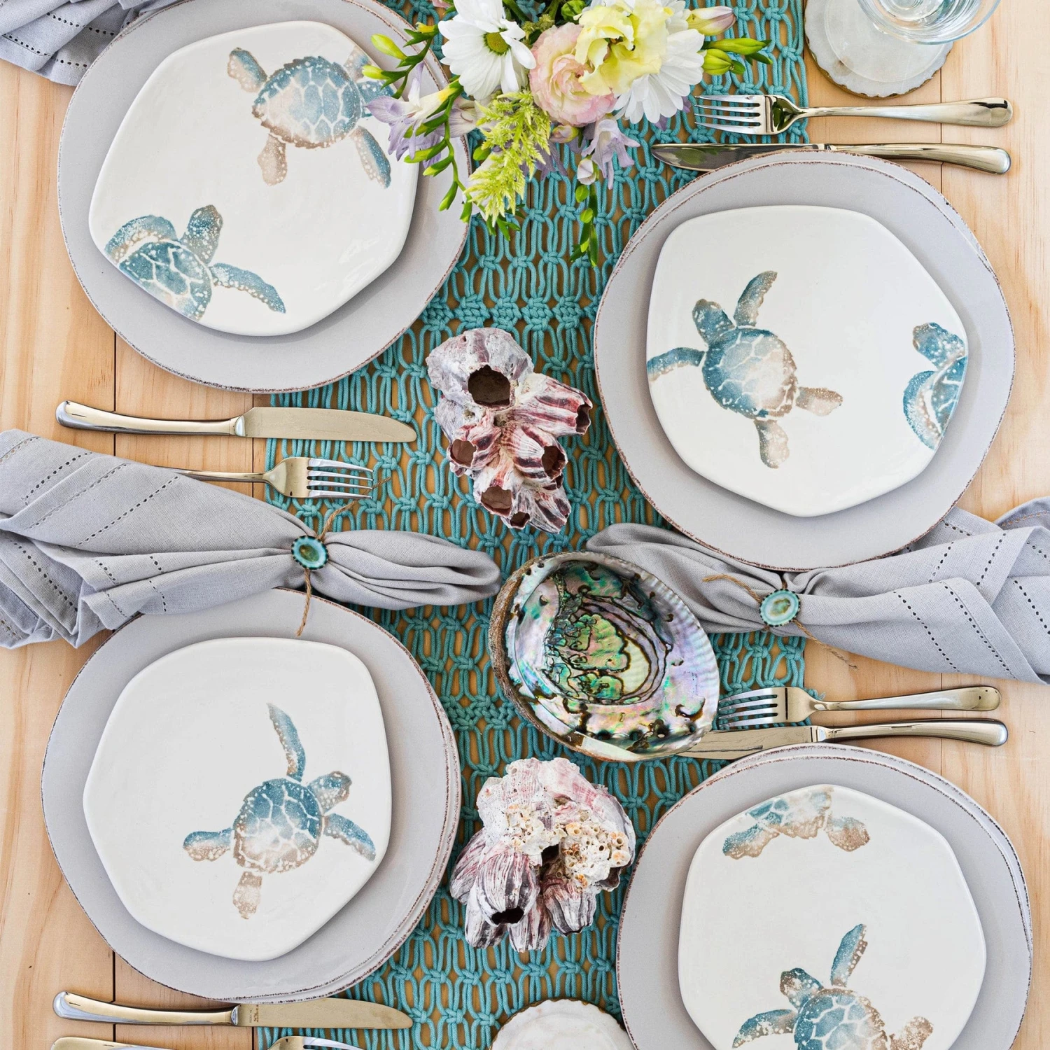 The handpainted sea turtle is rendered in hues of aqua and taupe against a clean, white canvas on the Tartaruga Turtle w/ Head Salad Plate. Maestro artisan, Gianluca Fabbro, utilizes a unique sponging technique to carefully add detail to each piece.
