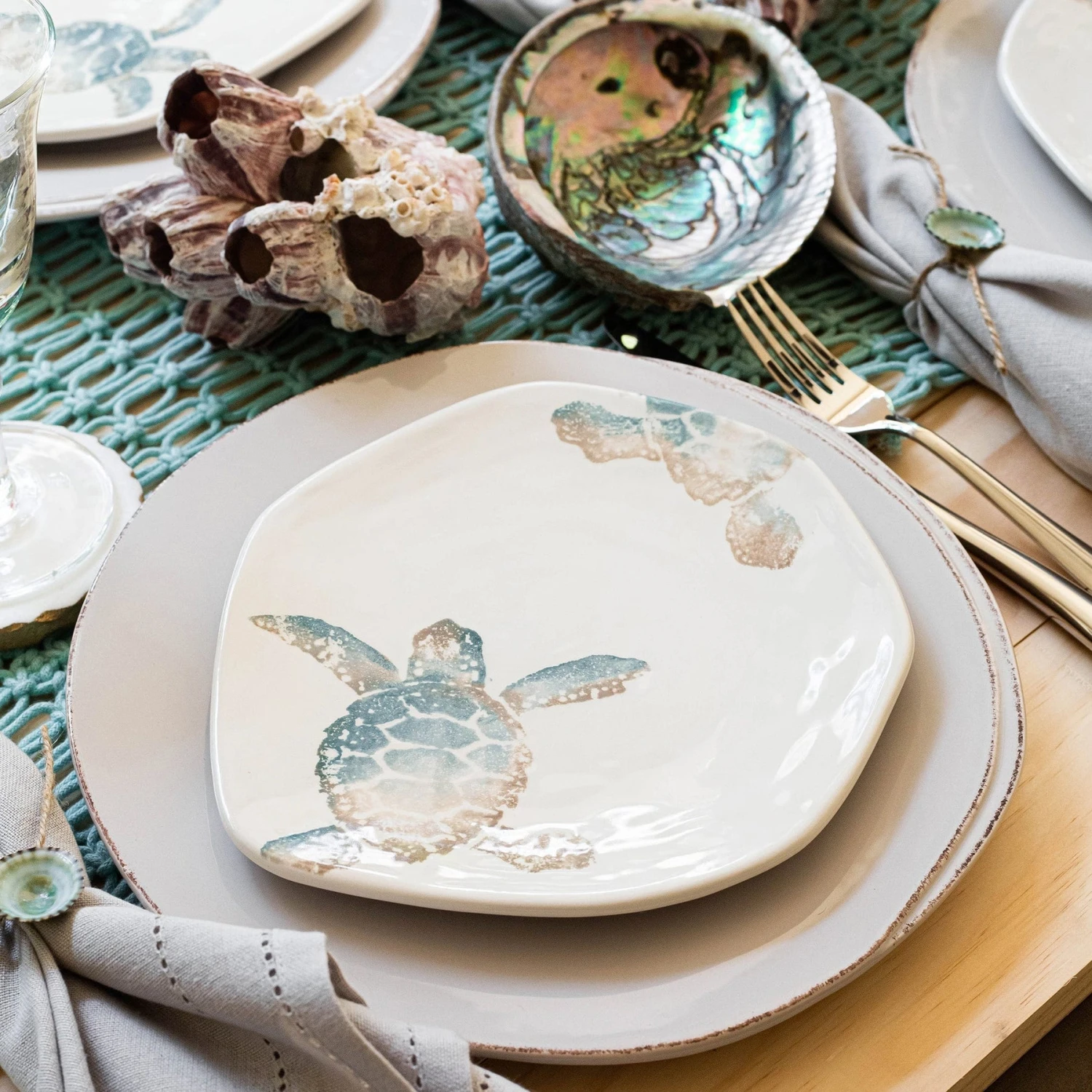 The handpainted sea turtle is rendered in hues of aqua and taupe against a clean, white canvas on the Tartaruga Turtle w/ Tail Salad Plate. Maestro artisan, Gianluca Fabbro, utilizes a unique sponging technique to carefully add detail to each piece.